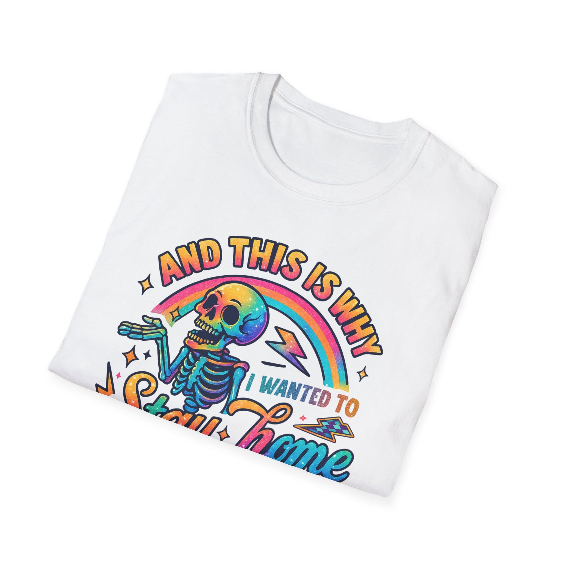 Stay Home Skeleton T‑Shirt — Retro Rainbow "I Wanted to Stay Home All This Time" Graphic Tee